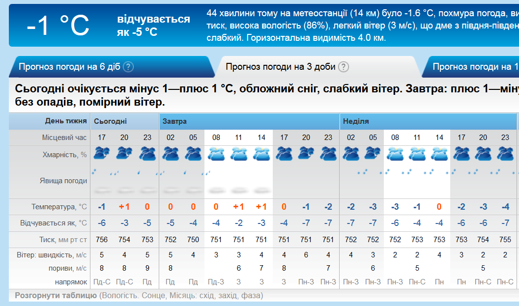 Ventusky жодних опадів нам на вікенд не прогнозує. У суботу, 4 лютого, погода буде похмурою, а температура повітря коливатиметься від -1ºС до +1ºС, а у неділю, 5 лютого, зранку сонце покажеться з-за хмар, а температура повітря знизиться до -4ºС.