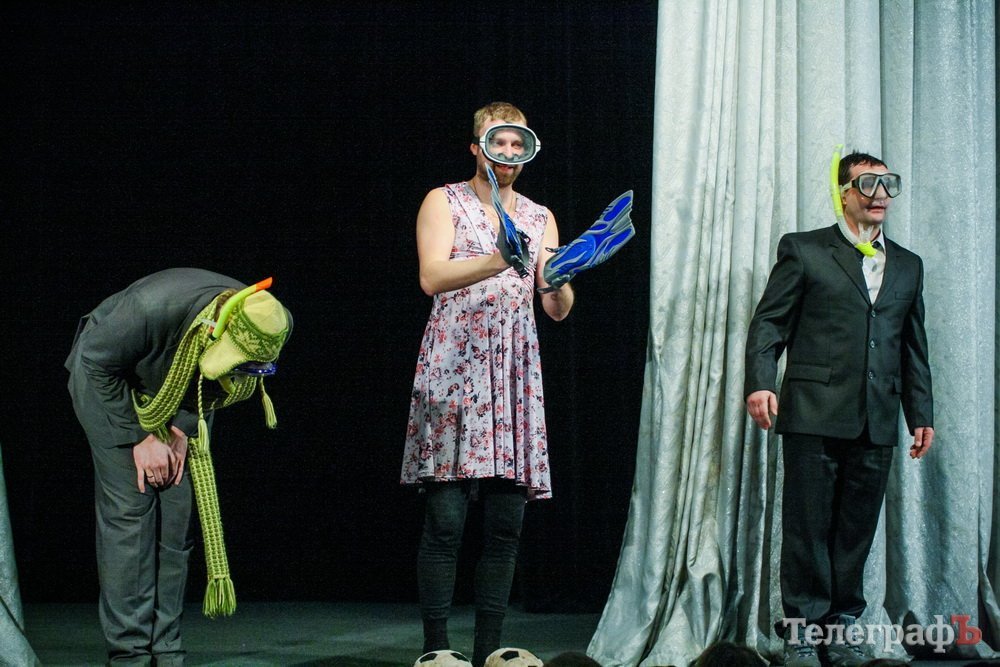 Разгадка наступает в конце: шеф-месье объявляет своему секретарю Жерому, что завтра они будут «погружаться». И надо найти ласты и маски. Мол, не зря же должен проходить рабочий день. Согласитесь, оригинальный способ скоротать офисное время. Ну, а вам не приходилось сталкиваться с причудами начальников, страдающих от избытка времени и желающих чем-либо его «загрузить» в ущерб самой работе? Эксцентричного месье-шефа сыграл режиссер театра «МО» Максим Воробьев, а бедного замученного секретаря – Евгений Лепа.