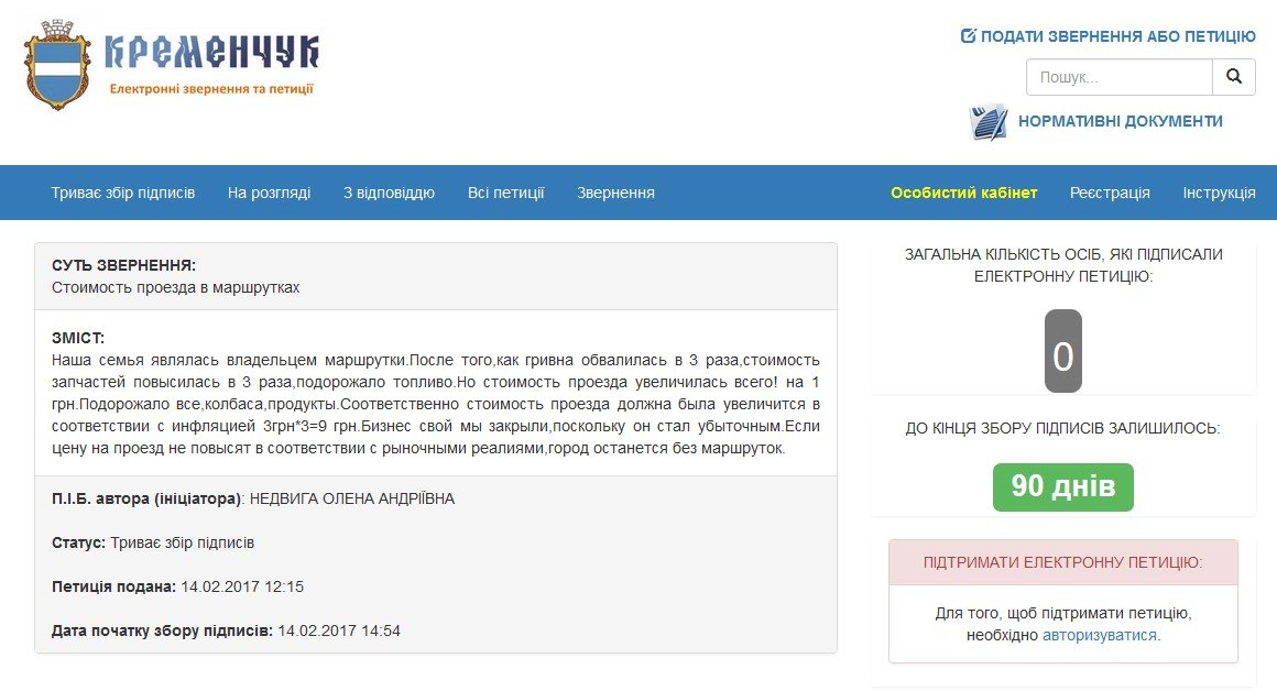 14 февраля на сервисе электронных петиций мэрии появилось новое обращение к мэру Кременчуга Виталию Малецкому с обоснованием необходимости повышения стоимости проезда в маршрутках на личном примере.