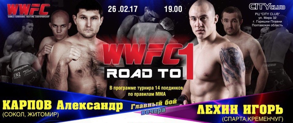26 лютого о 19.00 у Cityclub (Горішні Плавні) відбудуться бої WWFC road to. У програмі турніру 14 поєдинків за правилами MMA.