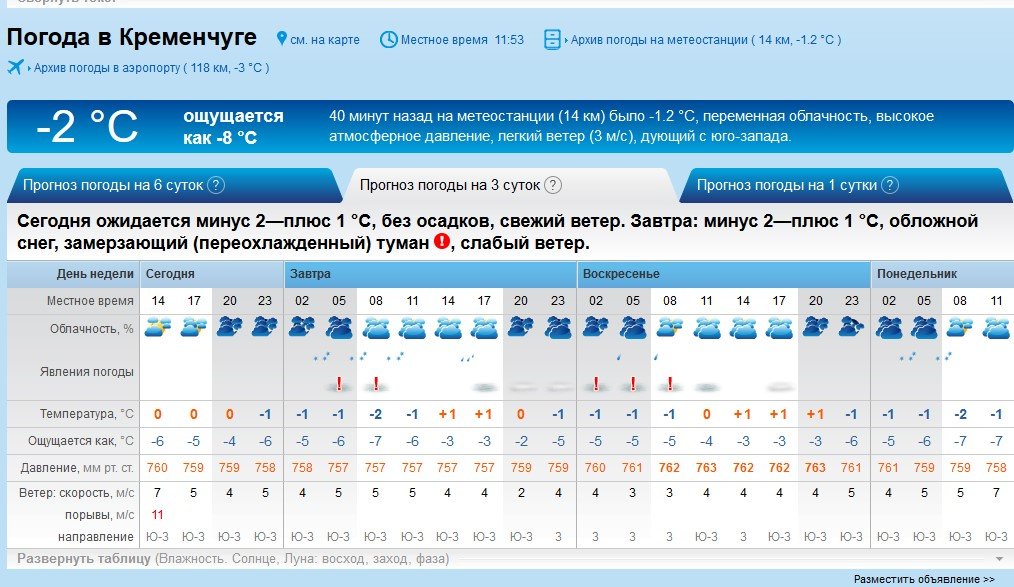 Про тумани з видимістю менше 1 км до 9-ї ранку суботи, 18 лютого, та 12-ї дня неділі, 19 лютого, попереджає Rp5. За їх прогнозом, хмари спустяться на Кременчук також ввечері 17 лютого, а вночі можливий серпанок. Також суботнім ранком очікують невеликий сніг, а ввечері та ранком наступного дня - дощ. Температура повітря коливатиметься від -2ºС до +1ºС.