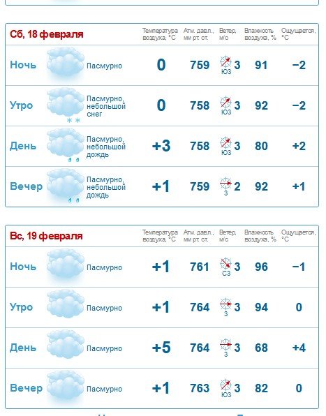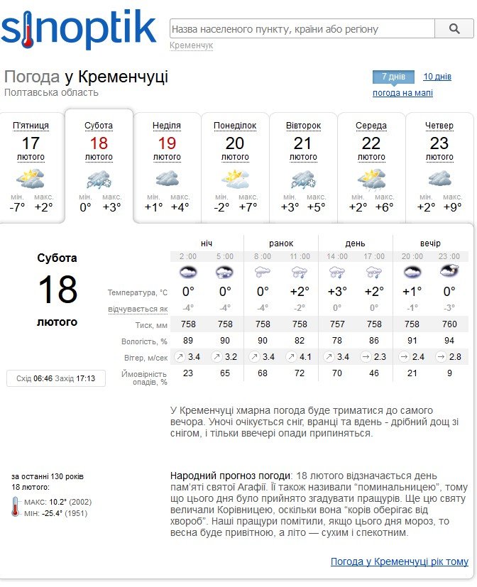 Опади у суботу, 18 лютого, обіцяють також на Sinoptik. Тут пишуть, що «хмарна погода буде триматися до самого вечора. Уночі очікується сніг, вранці та вдень - дрібний дощ зі снігом, і тільки ввечері опади припиняться». Стовпчики термометрів не опустяться нижче 0ºС, а максимально піднятися зможуть до +2ºС.