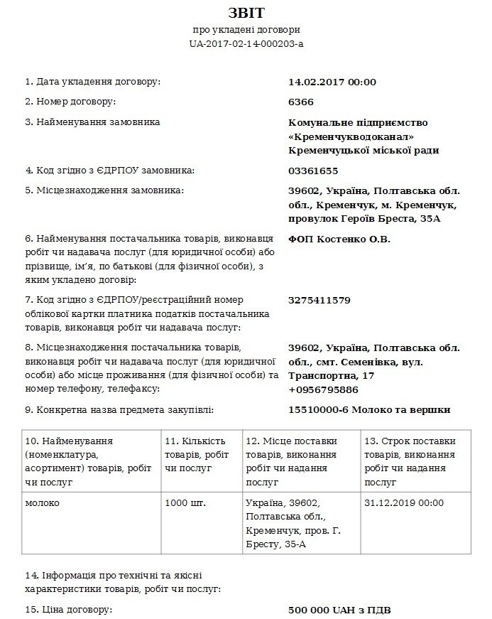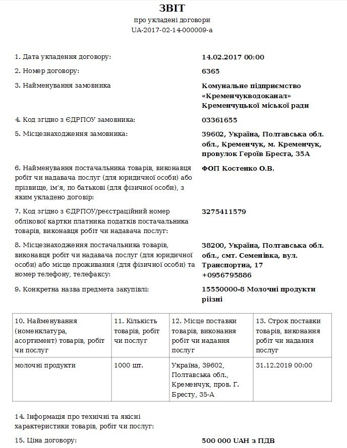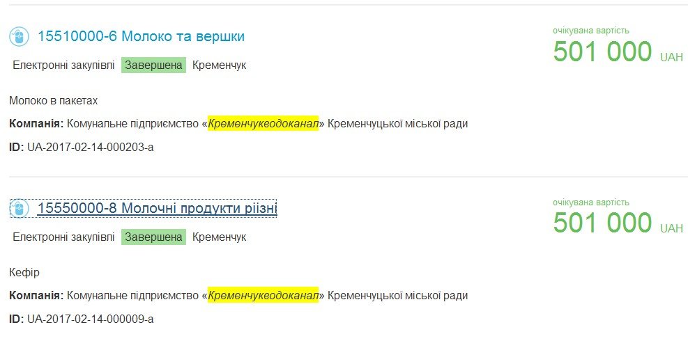 14 февраля «Кременчугводоканал» заключил два договора на поставку молочных продуктов на суммы по 500 тыс грн каждый. Информация о заключенных договорах размещена в системе электронных закупок ProZorro.