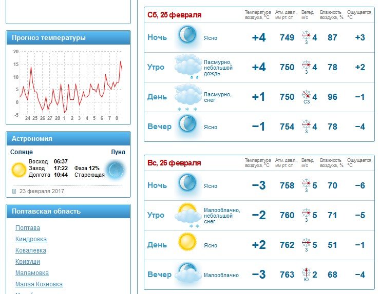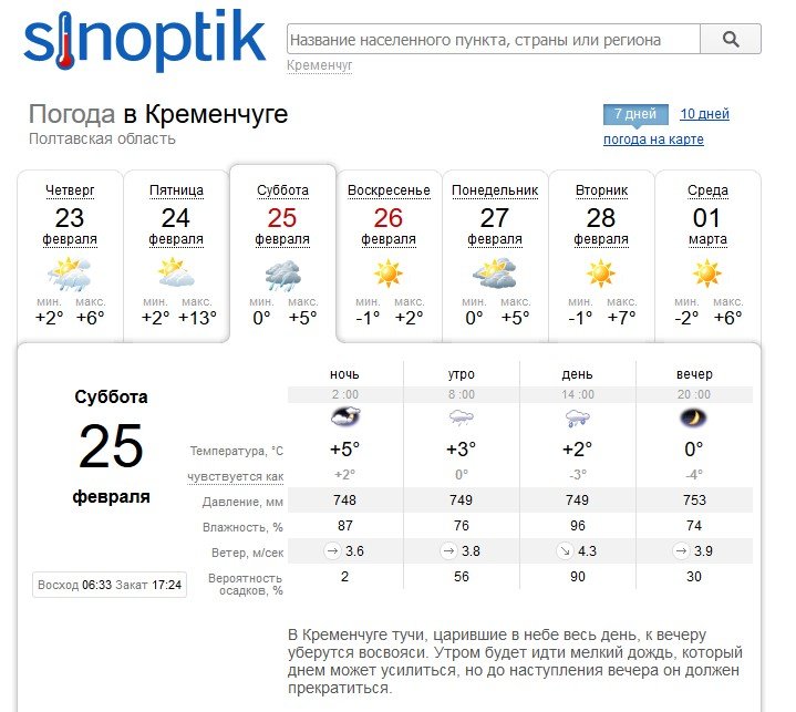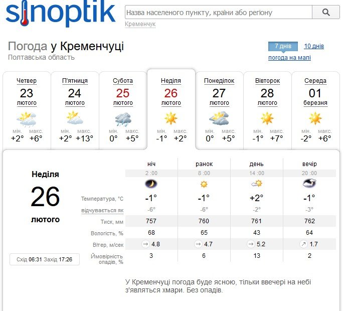 Вікенд без опадів обіцяє Кременчуку також rp5. За їх прогнозом, у суботу, 25 лютого, температура повітря не буде вищою за +7ºС, а у неділю, 26 лютого, коливатиметься від -1ºС до +4ºС.