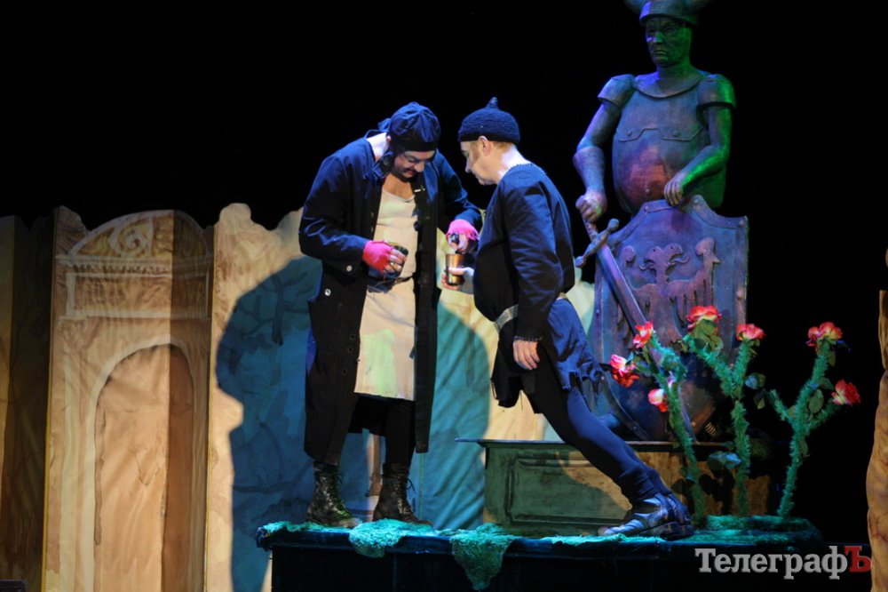 Необычен и второй план: в первой части спектакля, куда больше главных героев овации срывают философски настроенные клоуны-гробокопатели, работники кладбища, в лице Георгия Делиева и Александра Постоленко. Эти персонажи словно заимствованы из шекспировского «Гамлета», но они постоянно забывают о том, в каком веке находятся: шутят о президенте, чиновниках, ПриватБанке. Они рассуждают о жизни и смерти, о фэншуЕ, маракуе и алкоголе. Они обливают зрителей пивом, продают друг другу невидимую чудо-лопату, а невидимой шпагой косят цветы. Они, вопреки законам физики, умудряются стоять под невообразимым углом относительно земли, танцуют чечетку и меняют перегоревшую лампочку под потолком, откуда Делиев свалился прямо на пол, а зрители успели загадать желание, пока «падала звезда».