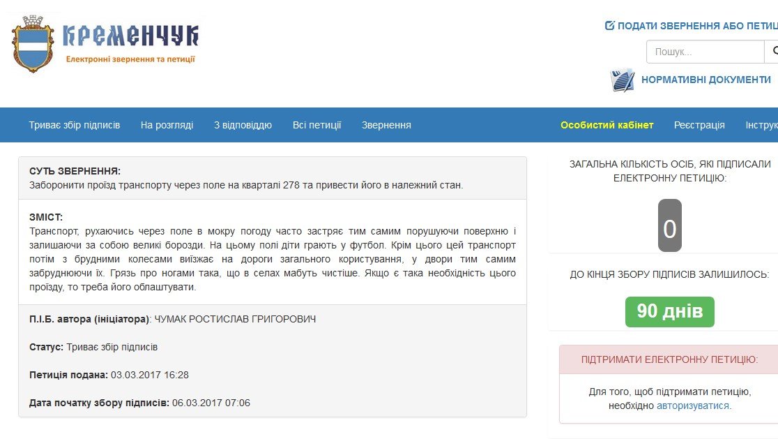 6 березня на сервісі електронних петицій мерії з'явилось нове звернення до мера Кременчука Віталія Малецького. Кременчужанин Ростислав Чумак просить міського голову заборонити проїзд транспорту через поле на кварталі 278 або, якщо це не можливо, то привести його в належний стан.