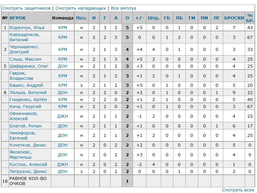 С 5 очками лидируют форварды горожан Илья Коренчук (3+2) и Виталий Кирющенков (2+3). На 3 и 4 местах кременчужане Максим Слыш и Дмитрий Чернышенко – по 4 (1+3) балла. По 3 (1+2) защитник Андрей Башко (Кременчук) и нападающие Владислав Гаврик (Кременчук) и Олег Шафаренко (Донбасс).