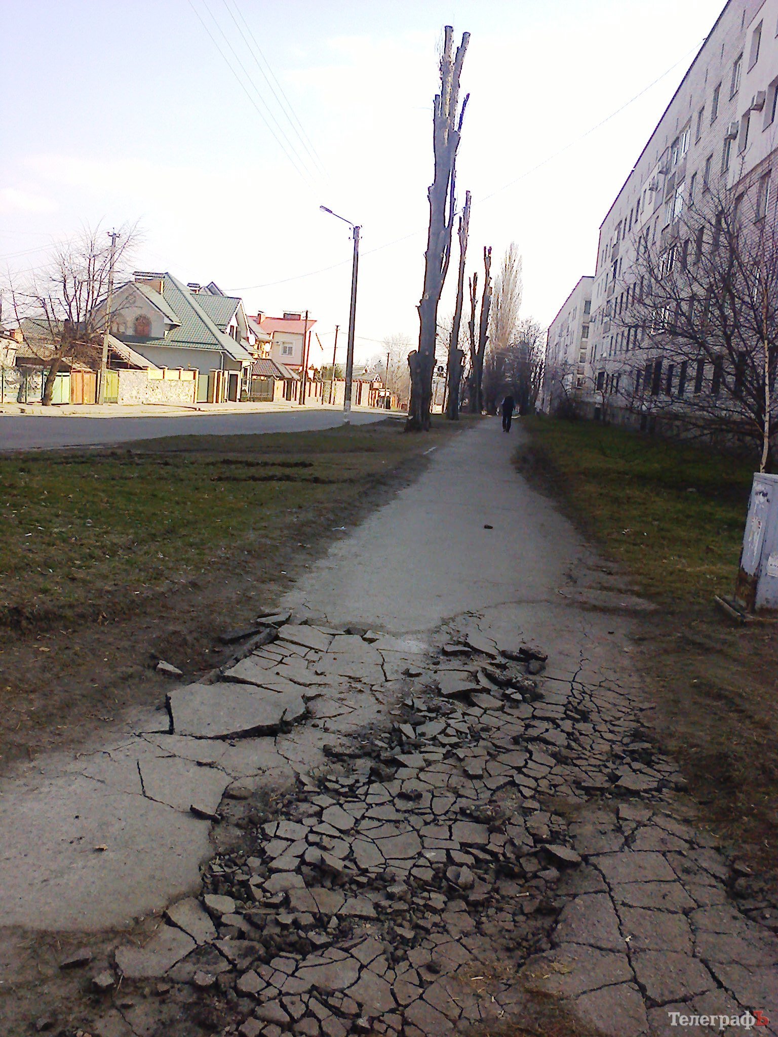 На прошлой неделе сотрудники коммунального предприятия «Благоустройство Кременчуга» проводили кронирование деревьев на ул. Европейской, по соседству с домом, в котором живёт мэр Кременчуга Виталий Малецкий. Деревья обрезали, но что осталось от асфальта?
