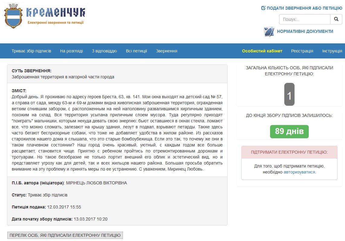 На сервисе электронных петиций мэрии появилось очередная петиция к мэру Кременчуга