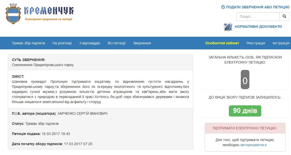 17 березня на сервісі електронних петицій мерії з'явилось нове звернення до мера Кременчука Віталія Малецього з пропозицією «по відновленню густоти насаджень у Придніпровському парку та збереження його як осередку екологічного та культурного відпочинку».