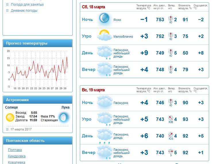 У свою чергу, rp5 попереджає кременчужан про серпанок з видимістю від 1 до 9 км суботнього ранку, а у неділю місто вкриє вже справжній туман з видимістю менше 1 км. Дощ, за їх прогнозом, почнеться ще у суботу, 18 березня, ввечері і литиме аж до ночі наступного дня. Температура повітря коливатиметься від -1ºС до +7ºС.