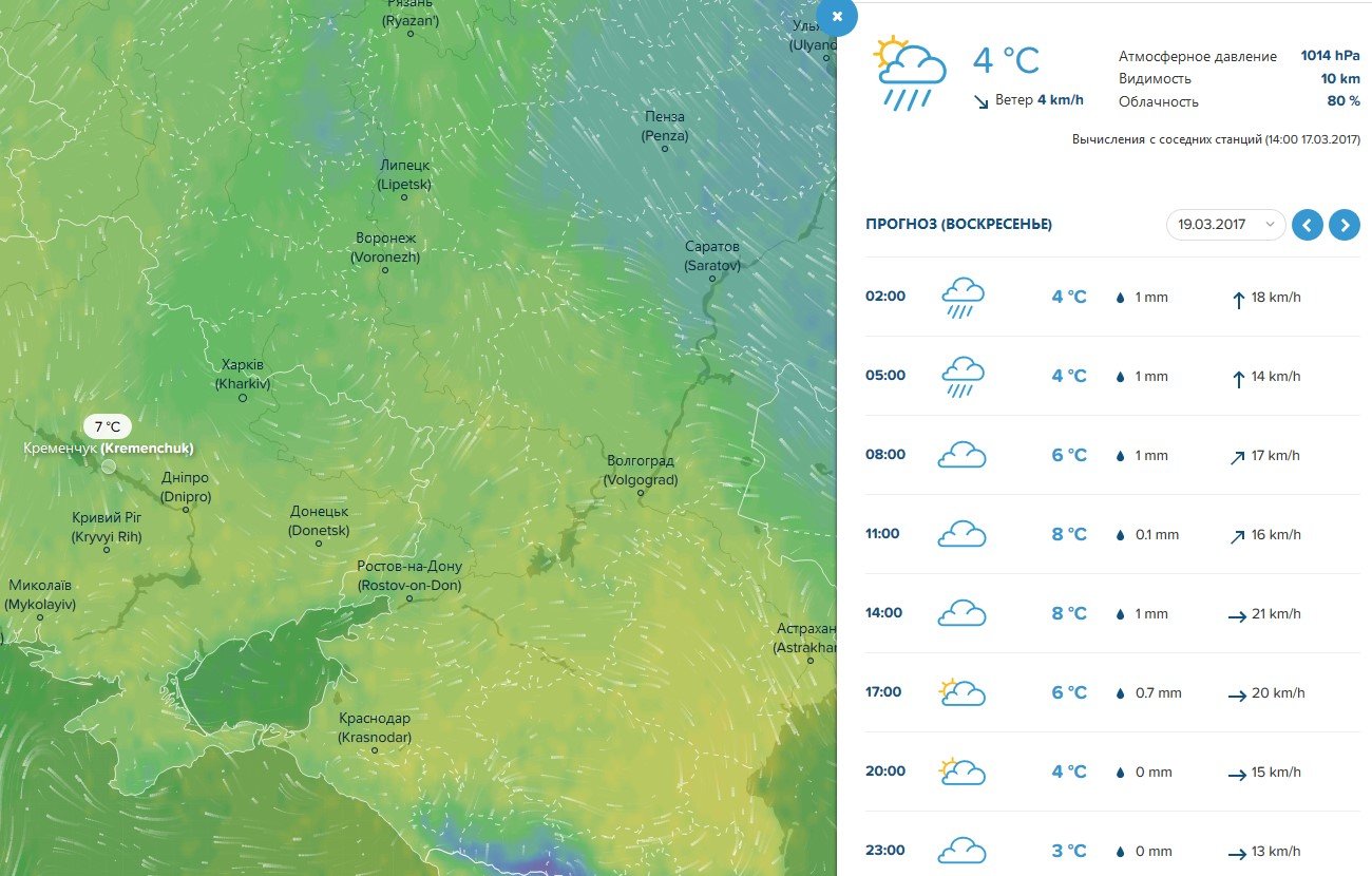 Ventusky попереджає нас про можливі пориви вітру до 12 м/с у суботу, 18 березня. Увесь день небо буде затягнуте хмарами, але опадів нам не прогнозують. Максимально повітря прогріється до +9ºС. У неділю, 19 березня, зранку та післяобід слід чекати на дощ, а стовпчики термометрів сягнуть +8ºС.