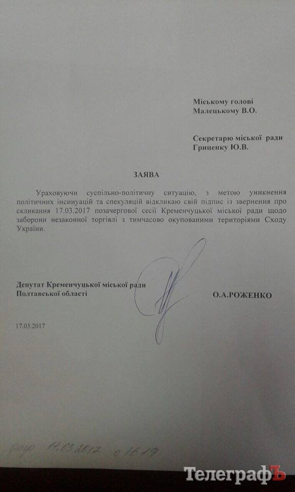 "ТелеграфЪ" располагает информацией о том, что депутаты горсовета Роженко и Шибашов (фракция «Рідне місто») отзывают свои подписи под обращением депутата Пиддубной о созыве внеочередной сессии по вопросу блокады торговли с оккупантами.