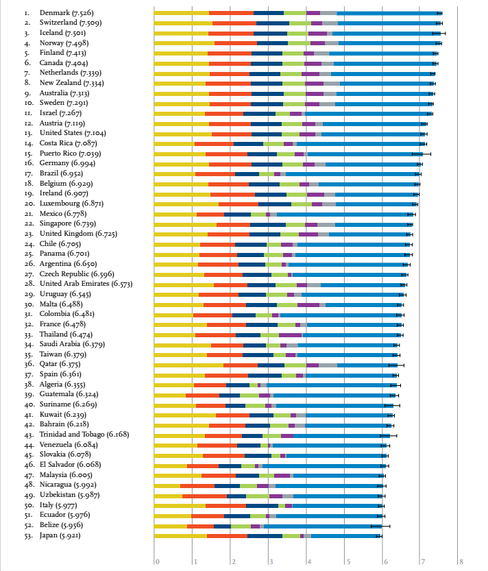 У доповіді «Всесвітнього Щастя 2017» зазначається, найбільше задоволені життям народи північної Європи - до п'ятірки країн, де живуть найщасливіші люди, увійшли: Норвегія, Данія, Ісландія, Швейцарія та Фінляндія. Далі у списку Нідерланди, Канада, Нова Зеландія, Австралія і Швеція. Німеччина посіла 16 місце за рівнем щастя. Велика Британія — 19, а Франція — 31. США втратили позиції та перемістились на 14 місце через зростання нерівності, недовіри у суспільстві та корупції.