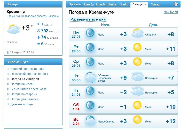 За інформацією управління прогнозування ДСНС України та Полтавського центру гідрометеорології, сьогодні, 27 березня, у Кременчуці очікується мінлива хмарність, без опадів, вітер північно-західний 5-10 м/сек, пориви 15-20 м/сек. Температура повітря по області: вночі…-2…+3ºС, вдень…+4…+9ºС.