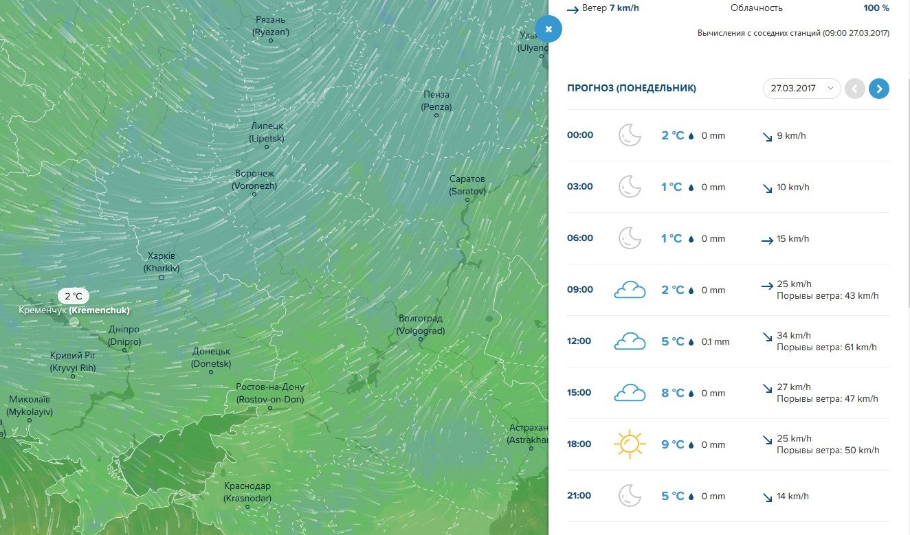 Про сильні пориви вітру попереджає кременчужан і ventusky. Вітрюган до 17 м/с підніметься сьогодні, 27 березня, та не вщухатиме до вечора, завтра, 28 березня, дутиме до 17 м/с, а у ніч на четвер, 30 березня, до 12 м/с. Дощу нам тут практично не обіцяють, хіба що в ту ж ніч на четвер, 30 березня. Температура повітря протягом тижня коливатиметься від +1ºС до +12ºС.