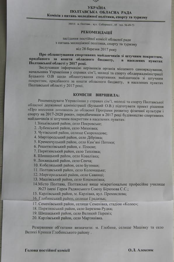Під Кременчуком у Кам'яних Потоках до кінця року з'явиться майданчик зі штучним покриттям. Загалом до жовтня планують зробити 20 майданчиків у 15 районах Полтавщини. За такий план спорудження депутати обласної ради проголосували під час засідання профільної комісії обласної ради. Раніше у плані було 18 об'єктів. Тим самим депутати рекомендували розглянути перелік на найближчій сесії, повідомляє прес-служба Полтавської обласної ради.