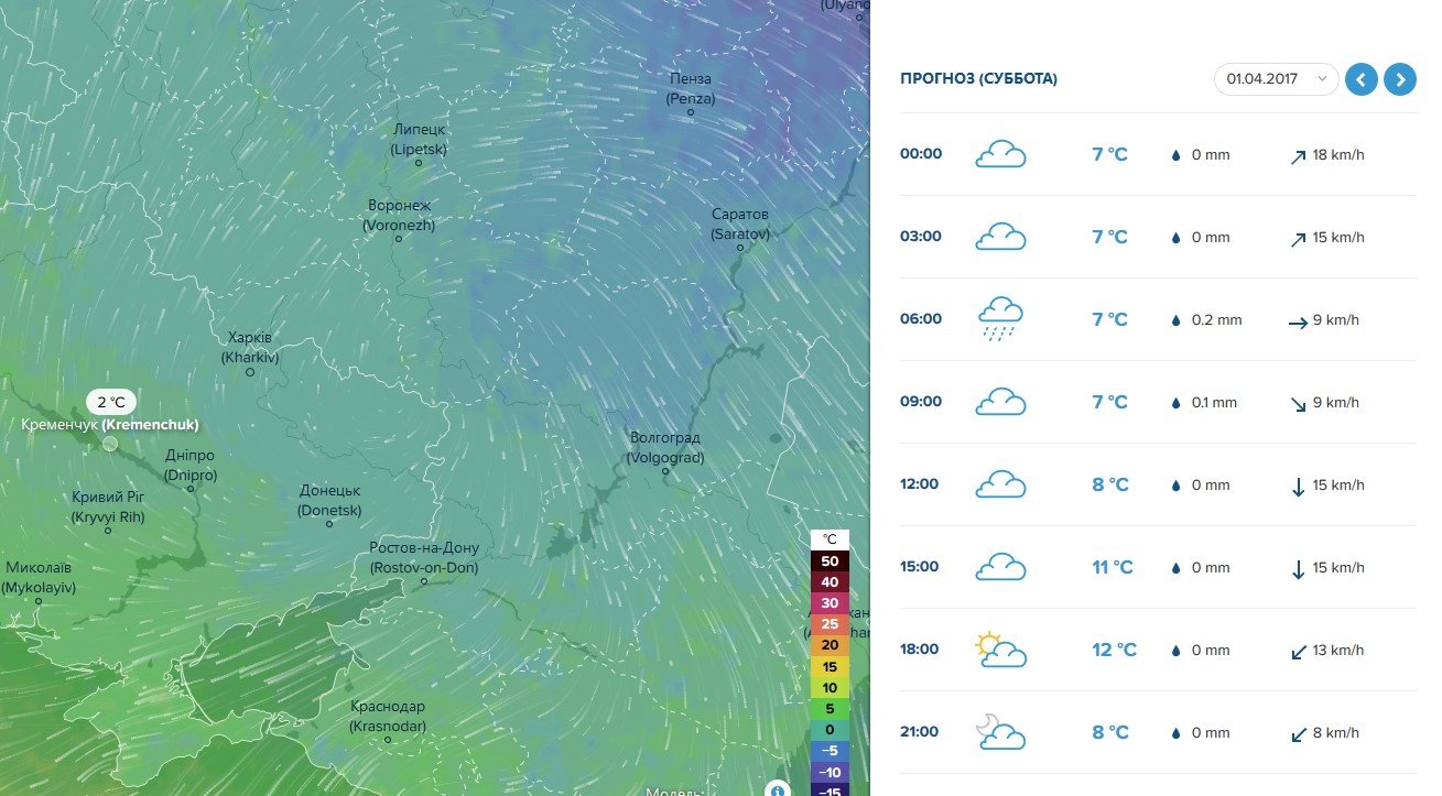 Субота, 1 квітня, за прогнозом ventusky, почнеться дощем, який завершиться вже до обіду. Небо увесь час буде заховане хмарами. Температура повітря коливатиметься від +7ºС до +12ºС.