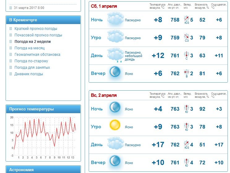 Дощик у суботу, 1 квітня, нам прогнозують і на gismeteo, але тут його обіцяють не зранку, а вже ближче до обіду. День має бути теплим, до +12ºС. У неділю, 2 квітня, має бути ще тепліше, до +17ºС, переважно ясно та без опадів.
