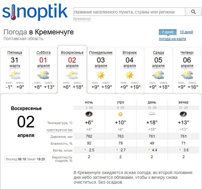 Про густі тумани, з видимістю менше 1 км, і в суботу, 1 квітня, і у неділю, 2 квітня, зранку попереджає кременчужан rp5. У суботу в першій половині дня також можливий дощ. Стовпчики термометрів не опустяться нижче +4ºС і не подолають позначки в +13ºС.