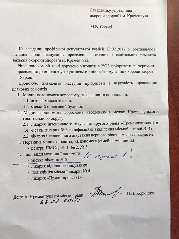В Кременчуге расставили по приоритетам ремонт в медучреждениях. Соответствующий документ обнародовали на депкомиссии по социальным вопросам 31 марта. Расставлял по приоритетам медучреждения член комиссии Александр Коркишко ("Укроп").