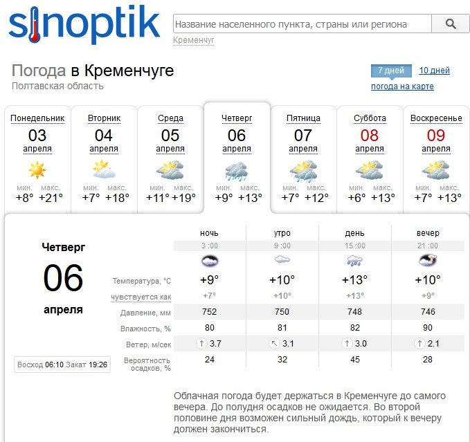 На rp5 Кременчуку теж обіцяють, що дощ мрячитиме з вівторка, 4 квітня, аж по суботу, 8 квітня, а у п'ятницю, 7 квітня, і взагалі перетвориться на зливу. Температура повітря коливатиметься на рівні від +3ºС до +16ºС.
