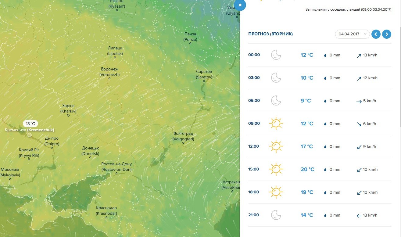 Теплу та ясну погоду на найближчі 3 дні Кременчуку обіцяють і на Ventusky. Максимально повітря прогріється до +20ºС уже завтра, 4 квітня. Хмари почнуть затягувати небо у середу, 5 квітня, у другій половині дня.
