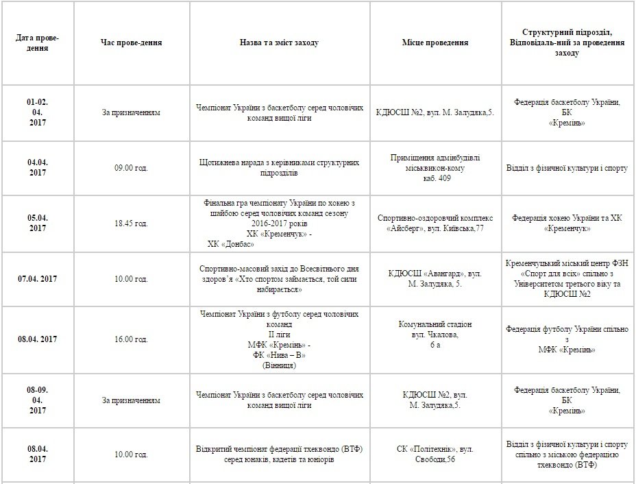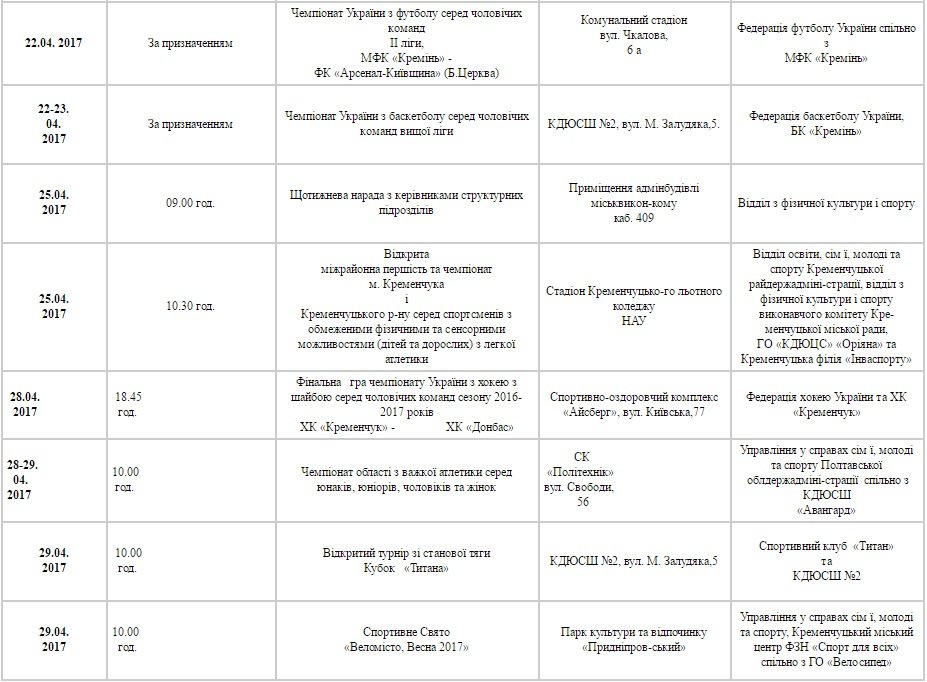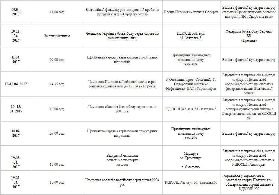 Спортивні заходи у Кременчуці на квітень. Щоб збільшити таблицю - натисніть на неї:)