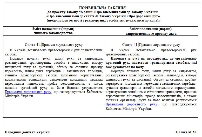 Відповідний законопроект №4246 "Про внесення змін до статті 41 Закону України" Про дорожній рух "(щодо пріоритетності транспортних засобів, що рухаються по колу)" 5 квітня підтримали 234 нардепи.