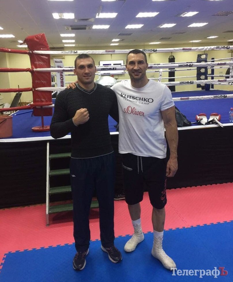 На фото Віктор Вихрист з тренером Сергієм Городничевим беруть безпосередню участь у тренувальному таборі Володимира Кличка