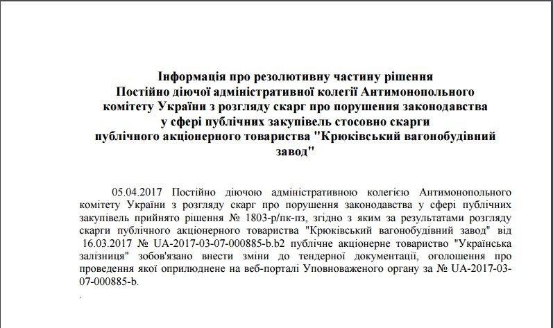 А пока на портале ProZorro в информации об объявленном тендере на закупку 6 дизель-поездов размещена резулятивная часть решения АМКУ, из которой ясно, что оно в пользу вагонзавода.