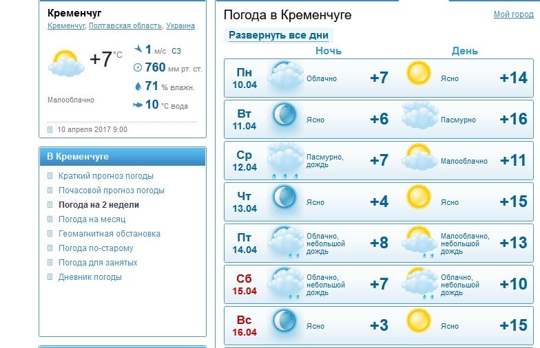 Rp5 також прогнозує нам дощі: зливу у першій половині дня суботи, 12 квітня, п'ятниці, 14 квітня, та в середині суботи, 15 квітня. Крім того, у п'ятницю, за їх прогнозом, Кременчук оповиє серпанок з видимістю від 1 до 9 км. Стовпчики термометрів протягом тижня не опустяться нижче +4ºС та не піднімуться вище за +15ºС.