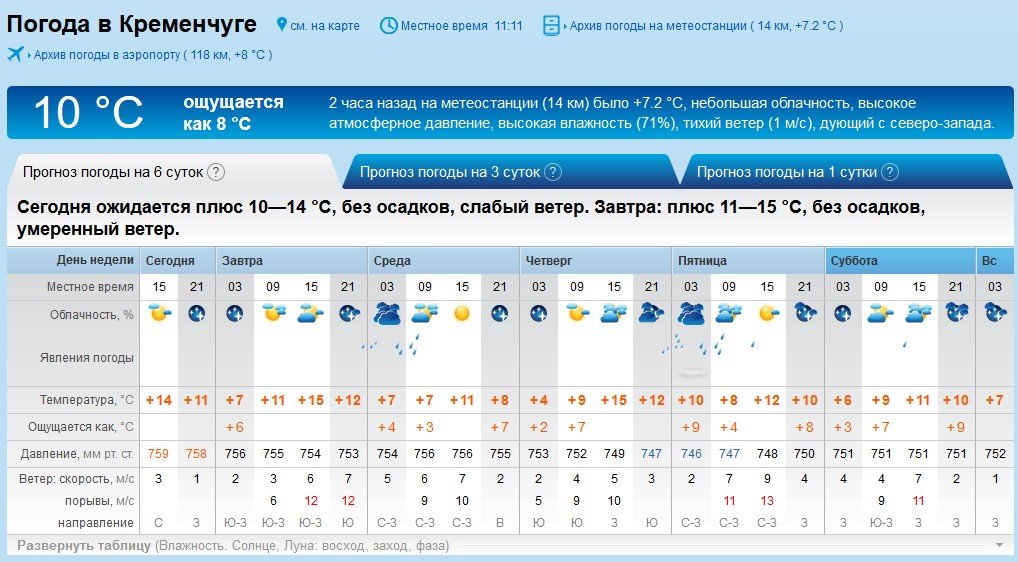 Gismeteo, в свою чергу, невеликий дощ прогнозує кременчужанам зранку у середу, 12 квітня, та протягом усієї п'ятниці, 14 квітня, та суботи, 15 квітня. За їх прогнозом, температура повітря коливатиметься від +4ºС до +16ºС.