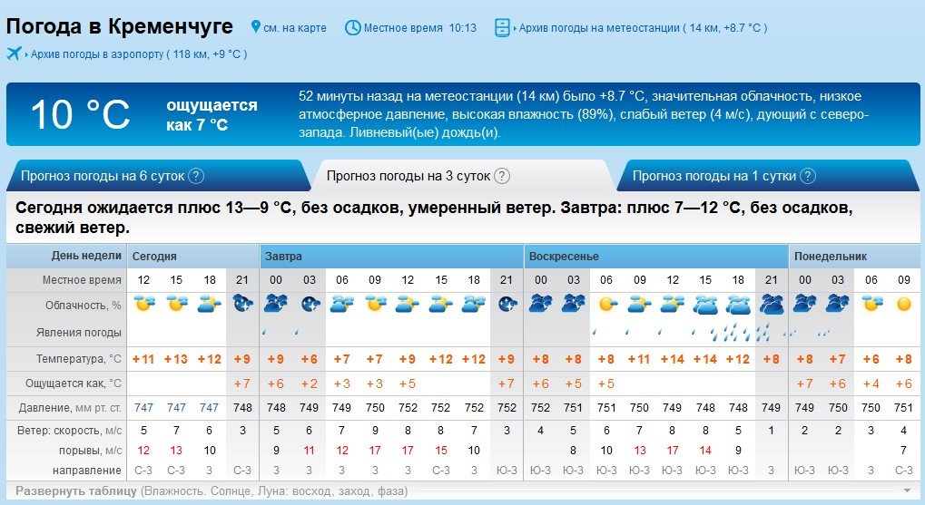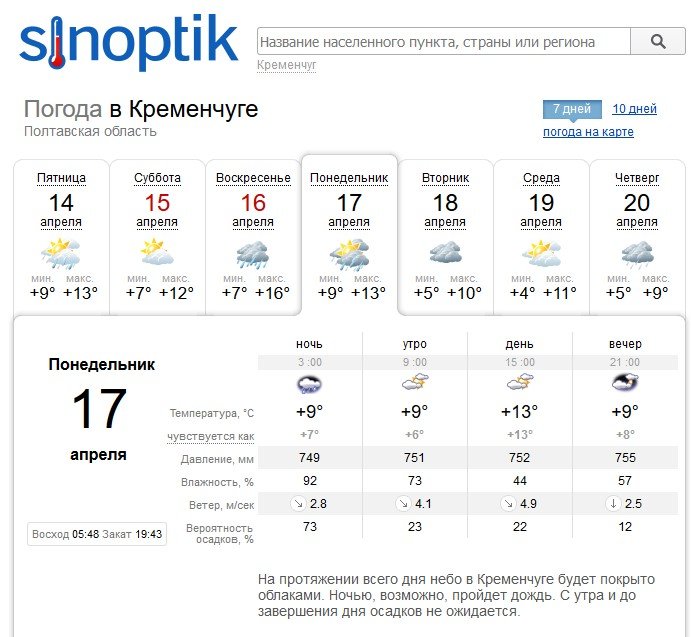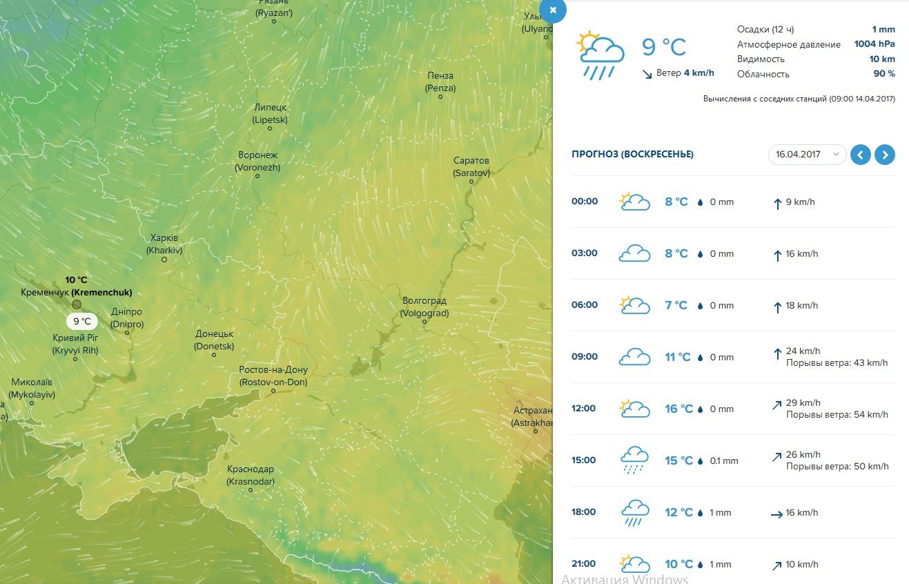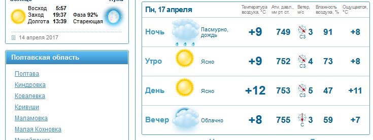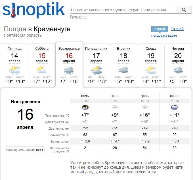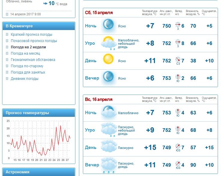 На Gismeteo кременчужанам прогнозують дощовиту погоду і у суботу, 15 квітня, і у неділю, 16 квітня, і у понеділок, 17 квітня. У суботу та понеділок погода буде малохмарною, а у неділю небо увесь час буде вкутане хмарами. Мінімально стовпчики термометрів опустяться до +6ºС, а максимально піднімуться - до +15ºС.