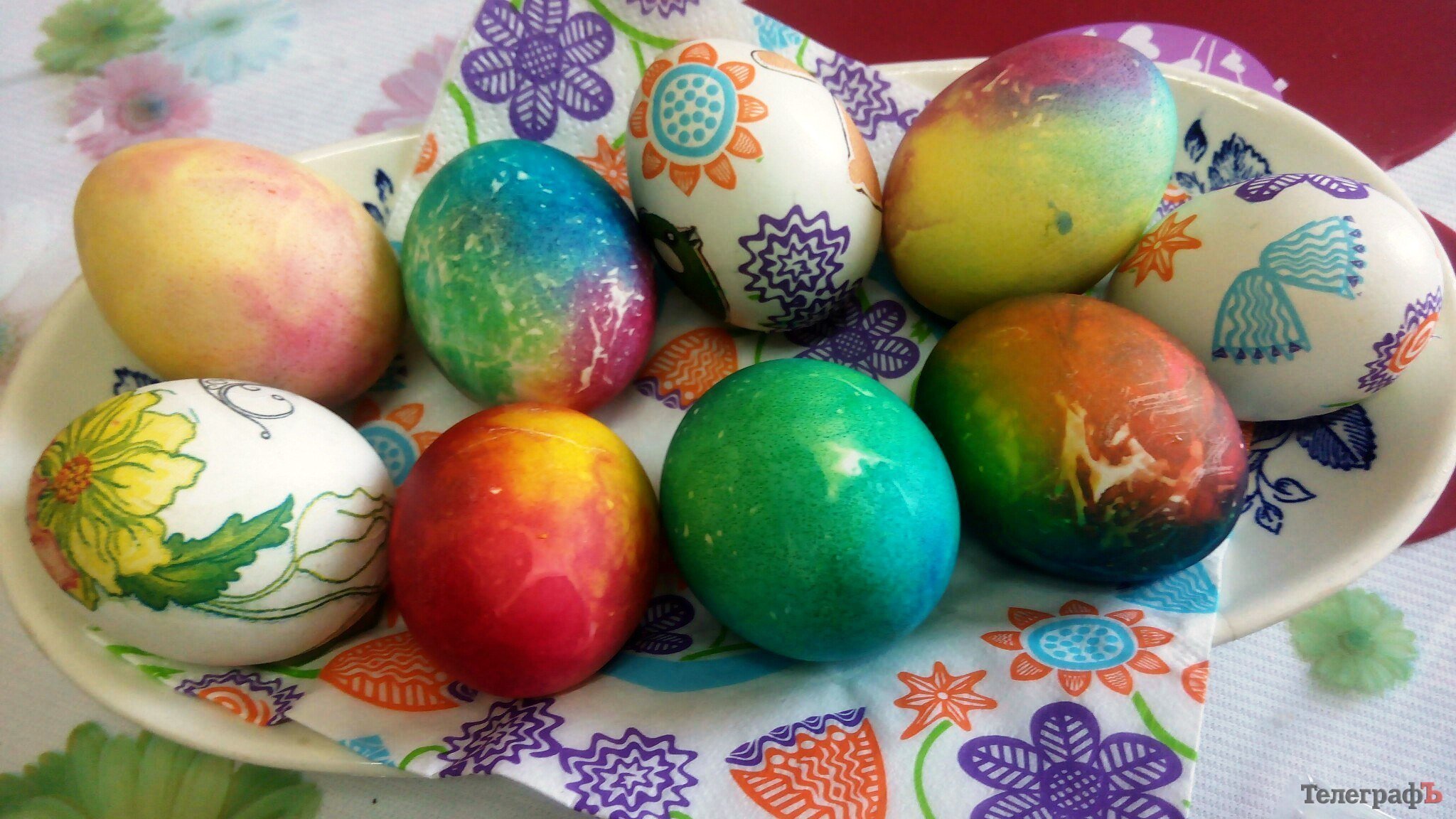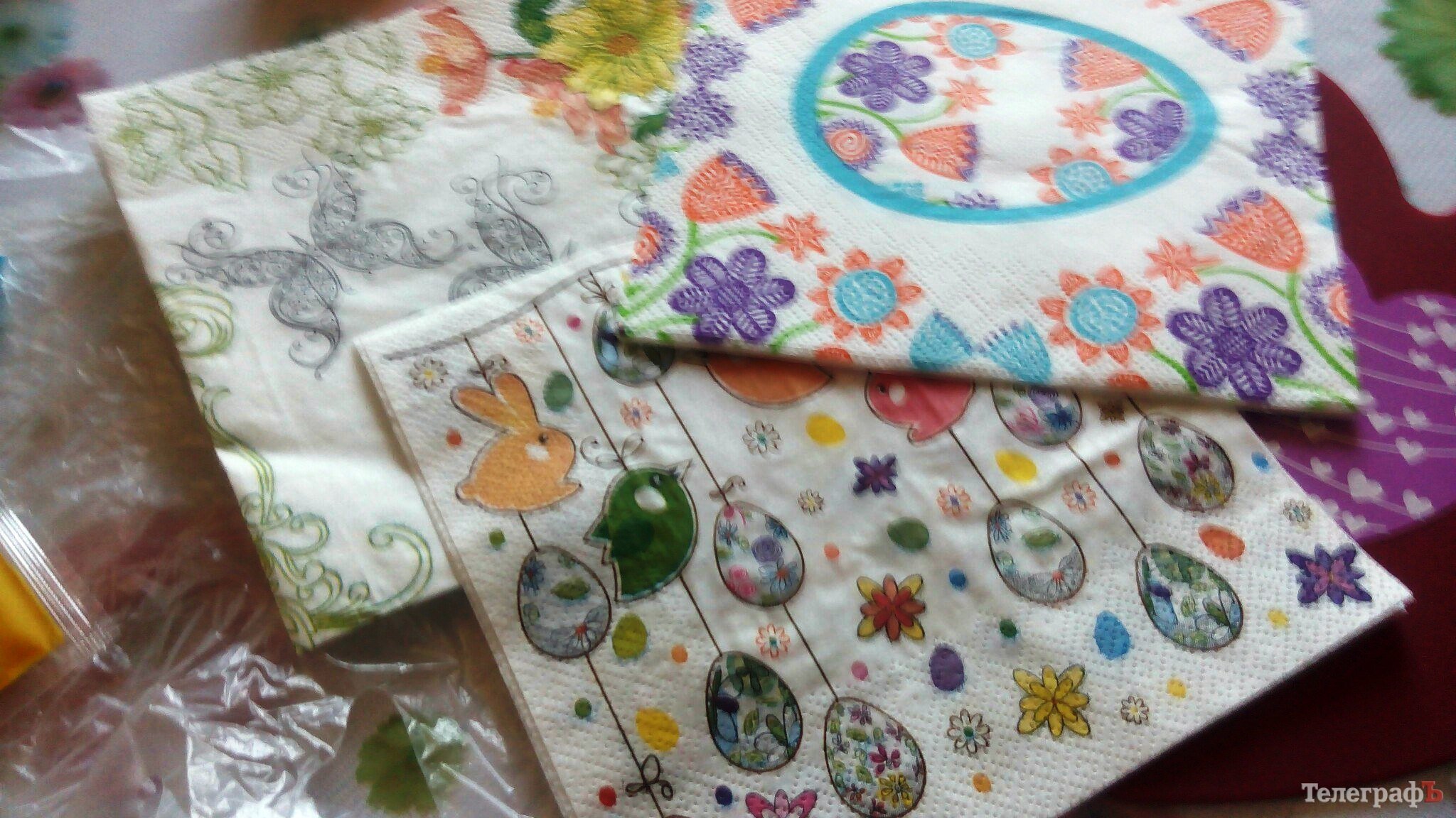 2. Выберете салфетки с красивыми цветными рисунками. В качестве фона лучше смотрятся белые яйца, хотя все зависит от цвета салфетки.