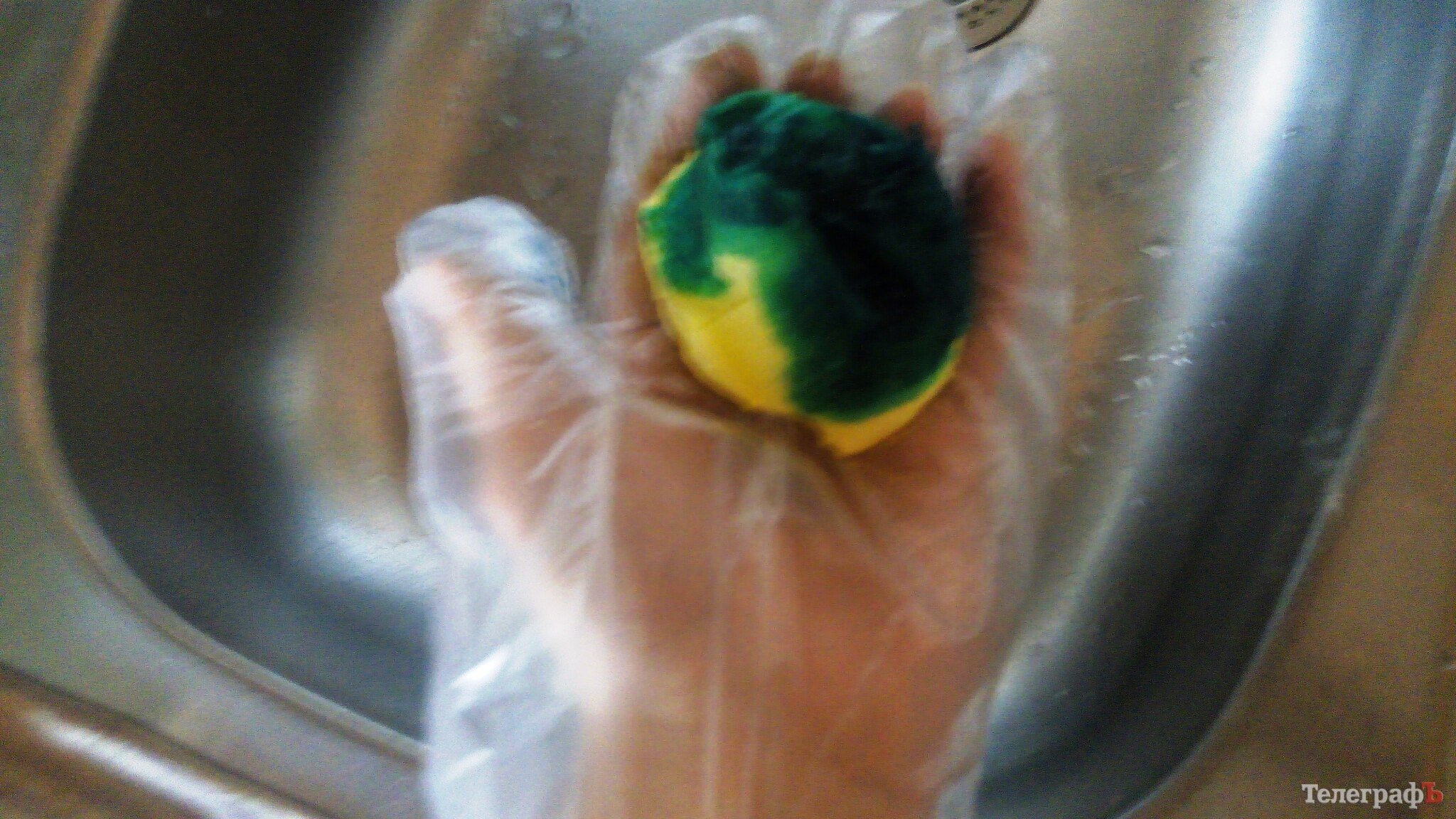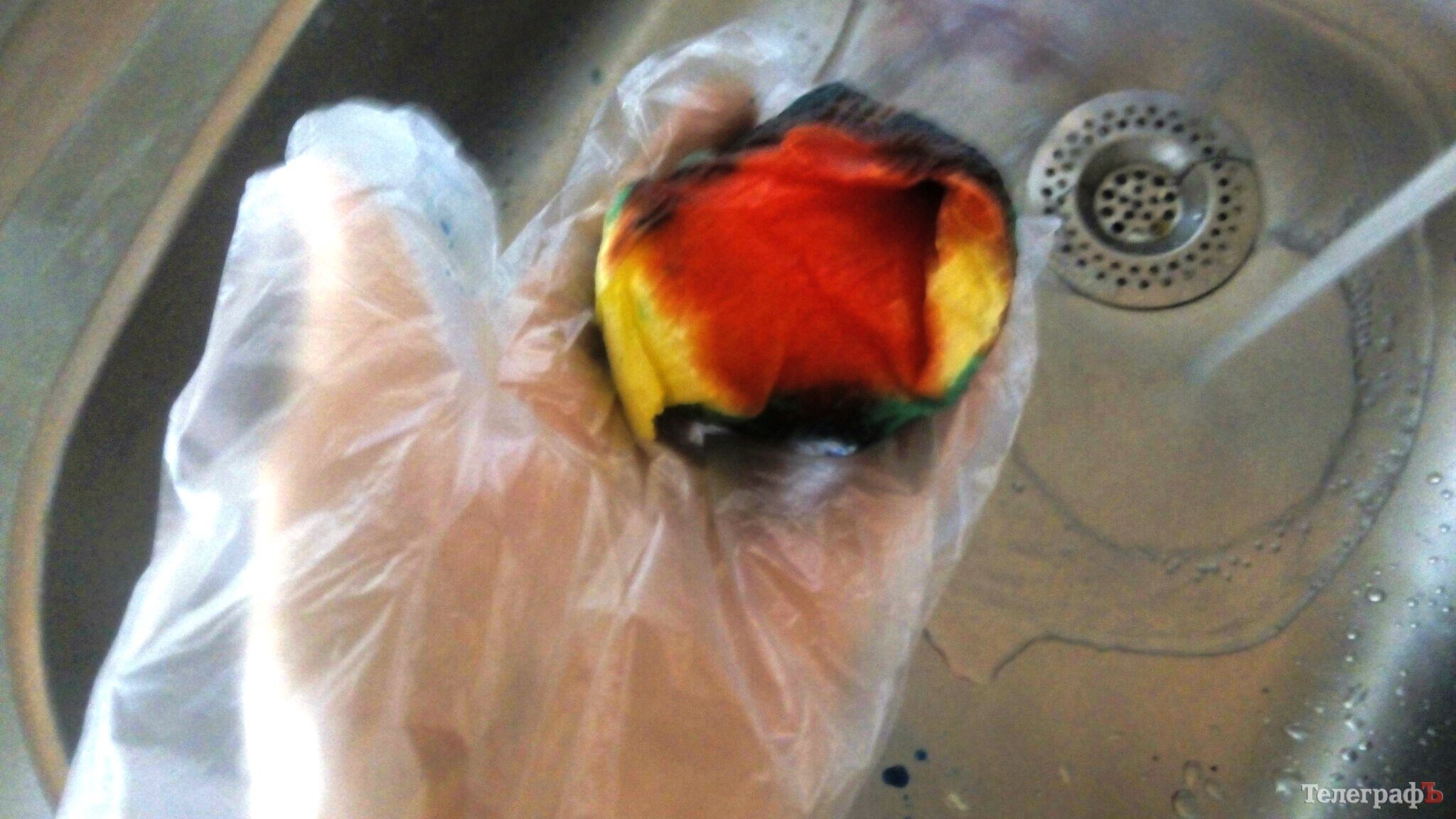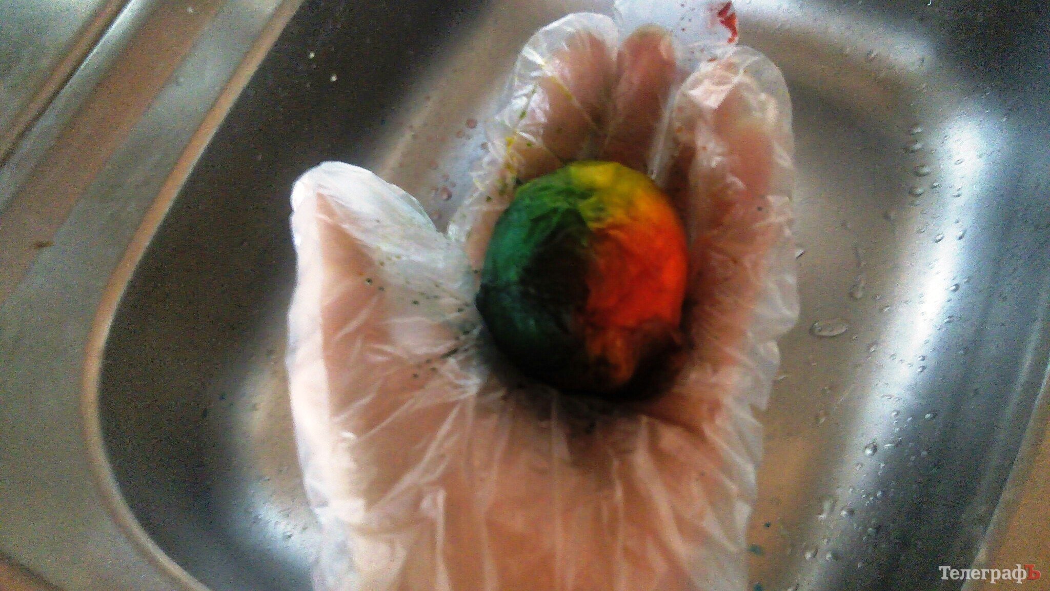 2. Оденьте перчатки, станьте над раковиной или возьмите удобную миску. Вылейте немного любого красителя на яйцо.