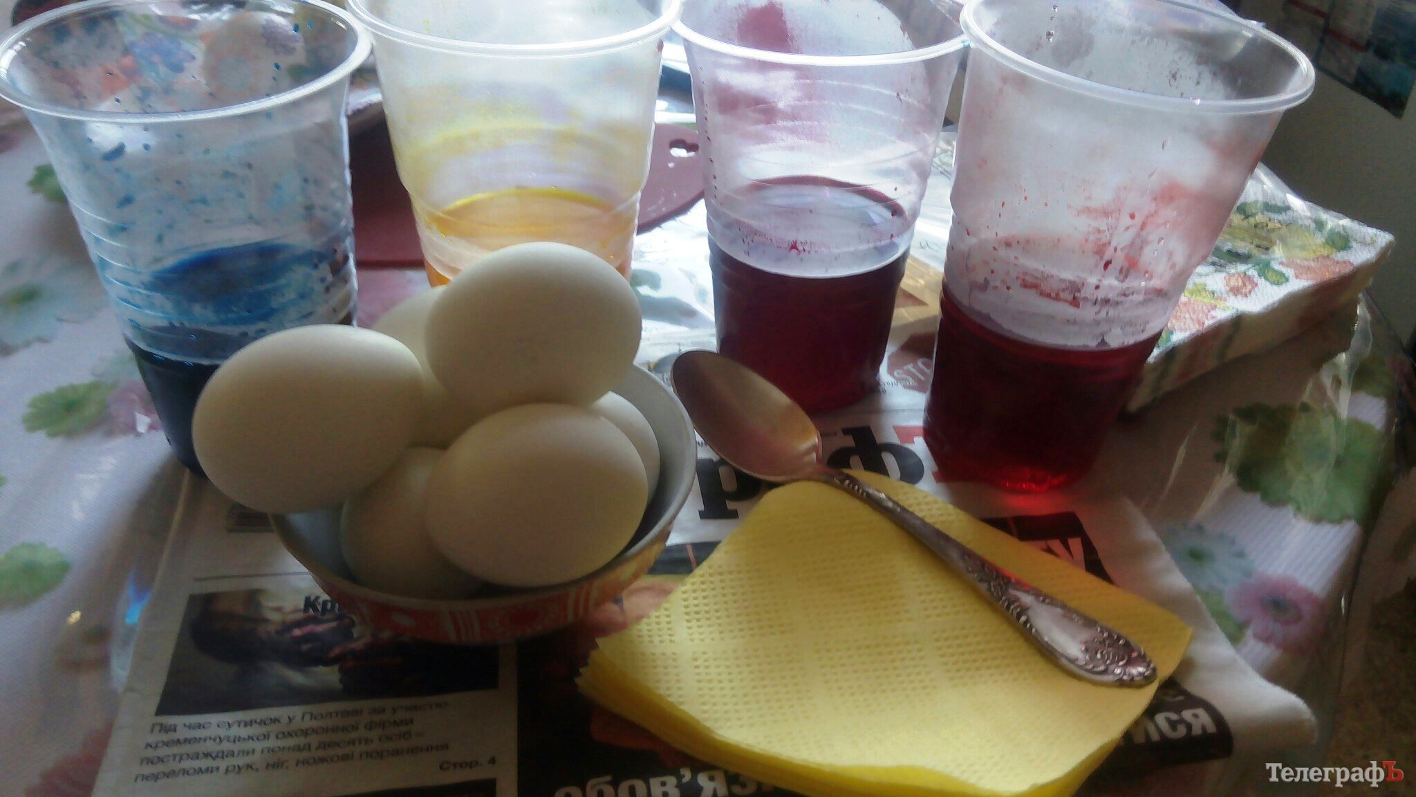 2. Налейте в отдельный стакан пару ложек красителя и поместите туда яйцо (удобно делать ложкой).