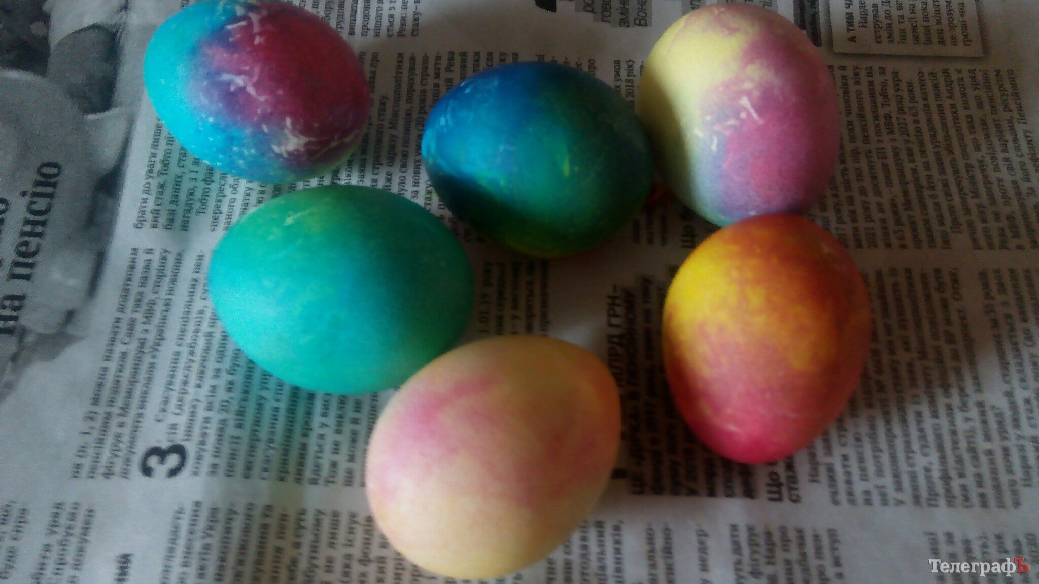 5. Размотайте салфетки, протрите яйца сухой салфеткой и дайте до конца просохнуть на газете, салфетке или решетке. Цвет готовых крашенок зависит от количества салфеток на яйце (больше салфеток – плавнее переход цвета но менее интенсивное окрашивание) и времени воздействия красителя.