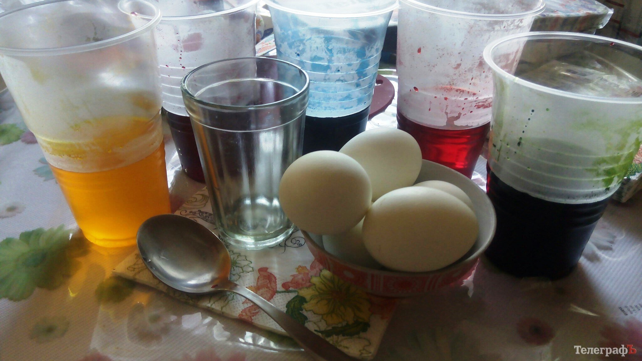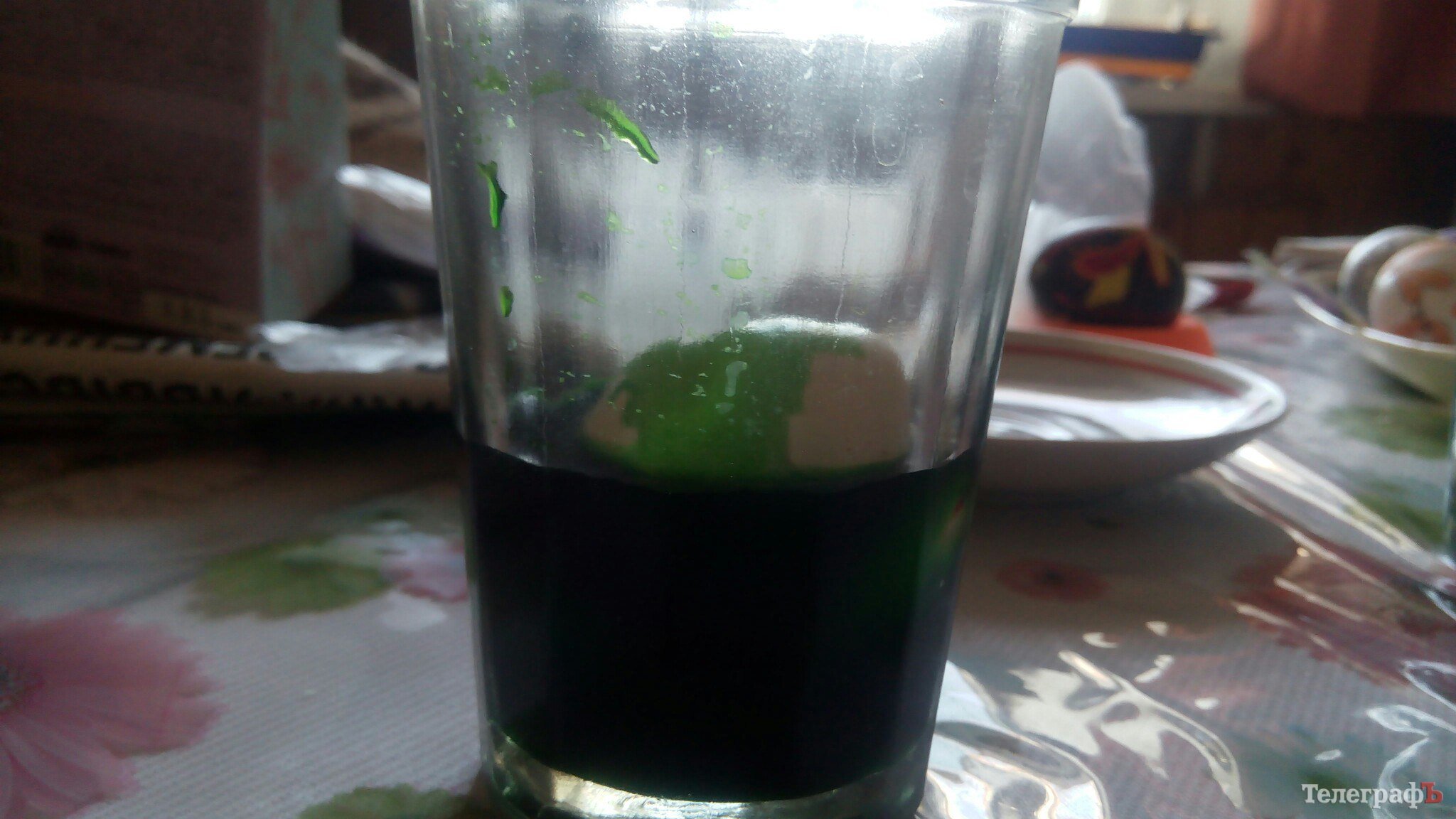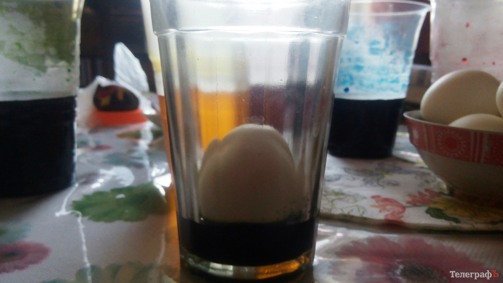 3. Подождите минуту и аккуратно, по стенке стакана, добавьте ещё 2 ложки красителя. Повторяйте, пока всё яйцо не покроется краской.
