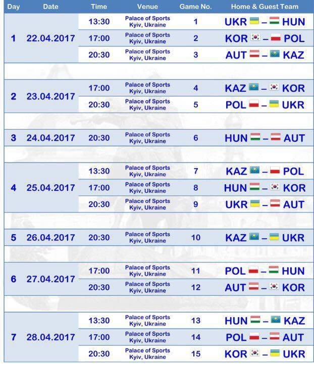 З 22 по 28 квітня в Україні пройде чемпіонат світу 2017 року з хокею в дивізіоні 1А. Суперниками наших хокеїстів на льоду київського Палацу Спорту стануть збірні Казахстану, Австрії, Угорщини, Польщі та Південної Кореї. Дві кращі команди за підсумками чемпіонату вийдуть в елітний дивізіон світового першості, а найгірша збірна вилетить в Дівізон IВ.
