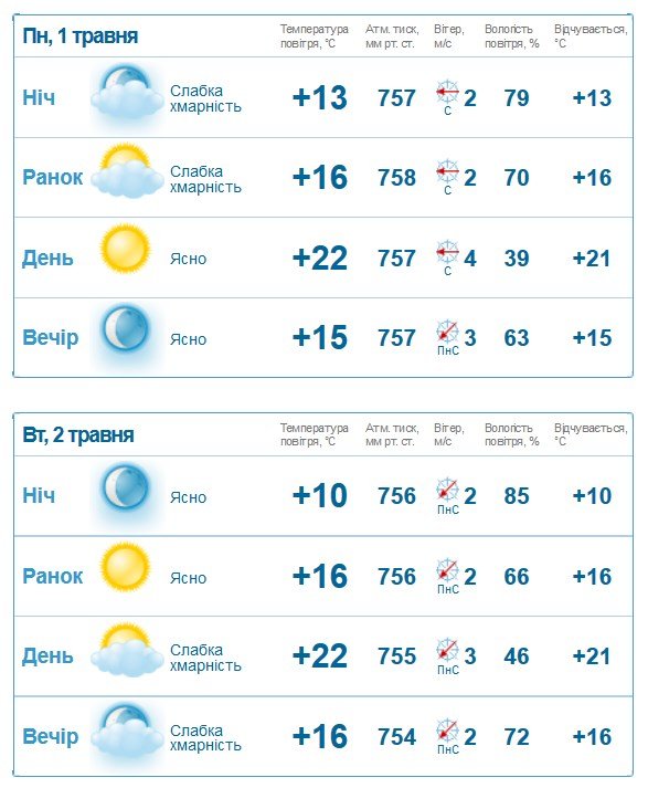 Схожий прогноз на rp5: температура повітря від +13ºС до +23ºС, ясна субота, 29 травня, та мінлива хмарність увесь інший час. Без опадів.