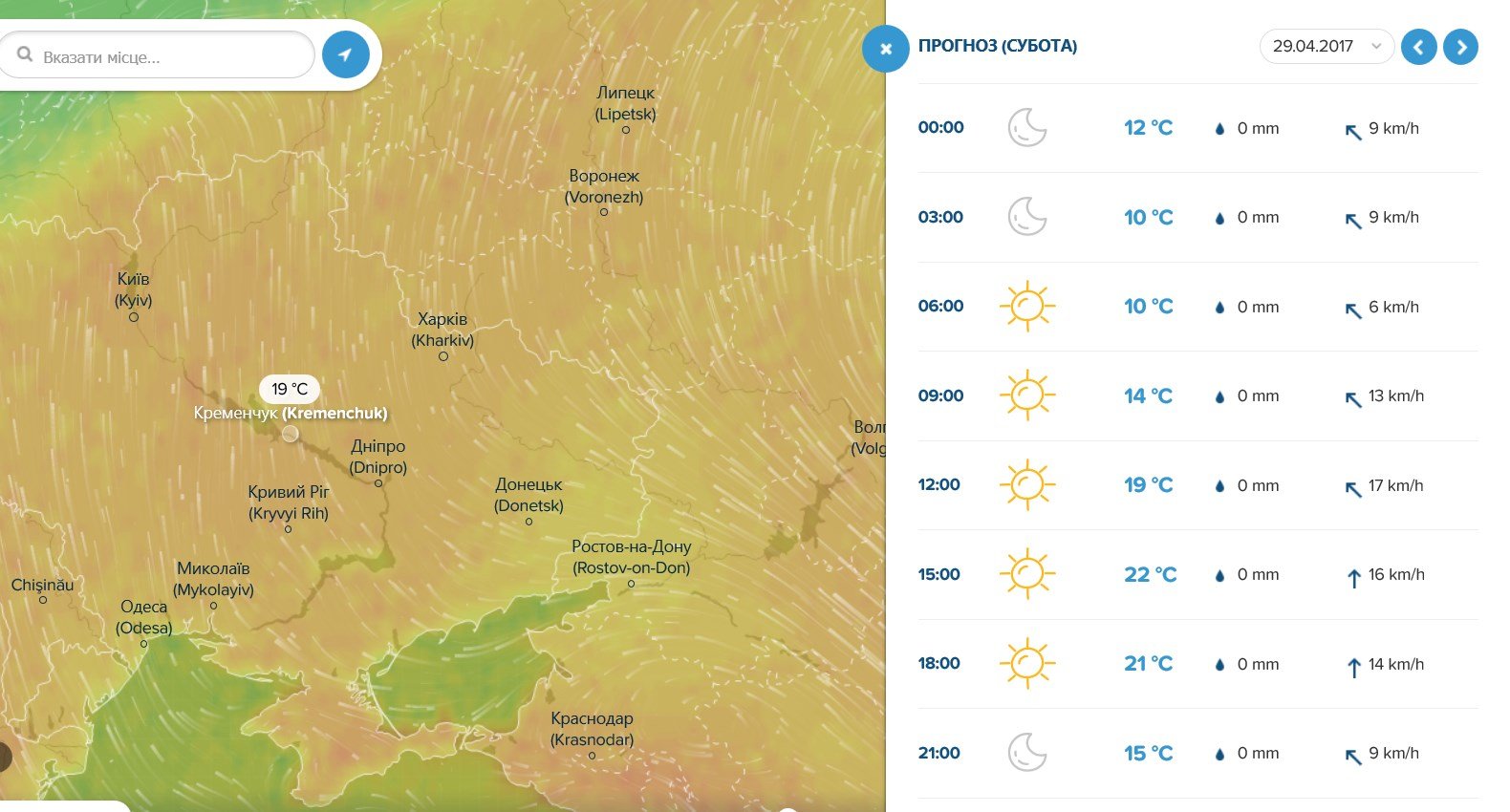 Згідно з Ventusky, усю суботу, 29 квітня, небо буде ясним, а погода - сонячною. Стовпчики термометрів сягнуть позначки у +22ºС.