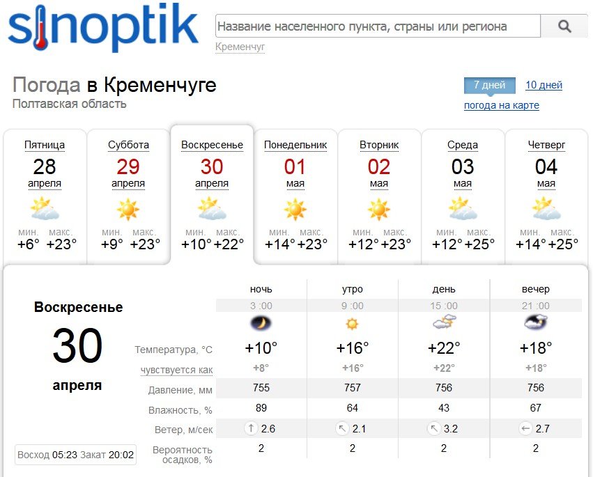 Gismeteo обіцяє Кременчуку, що максимально повітря прогріється до +22ºС, при цьому ясною буде лише субота, 29 квітня, а далі сонце періодично ховатиметься за хмарами. Опадів не прогнозують.