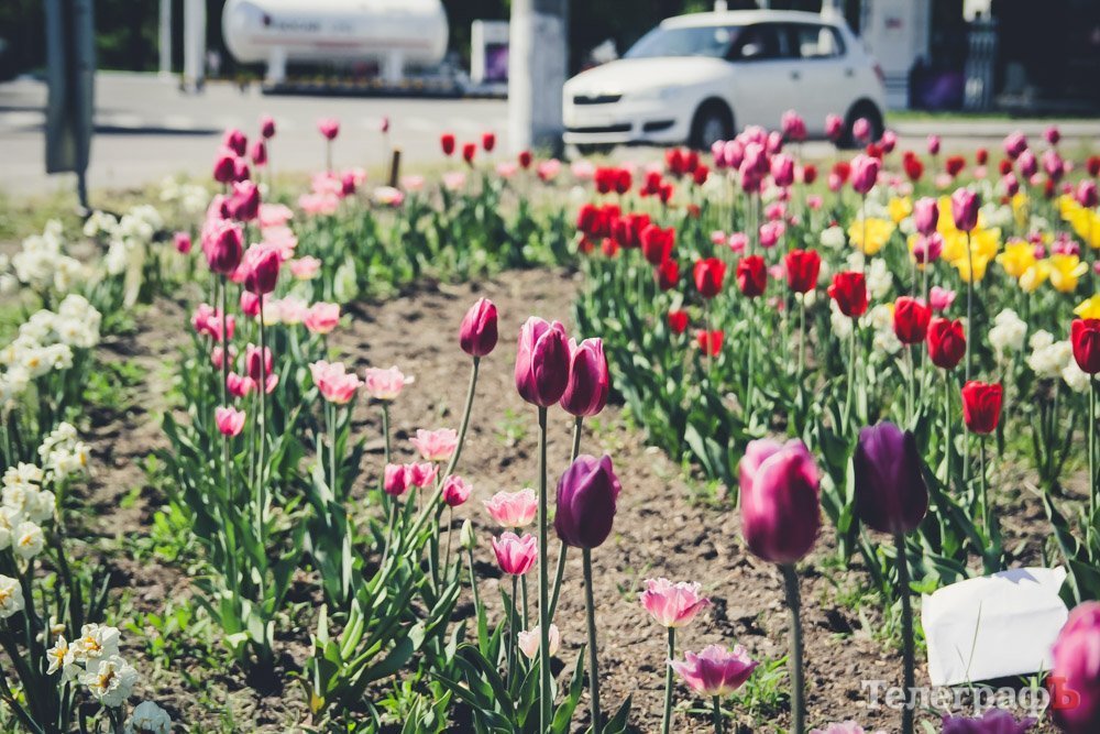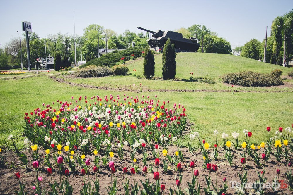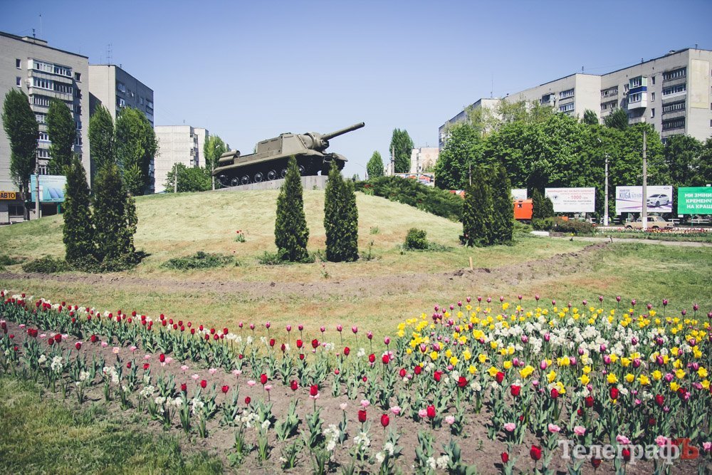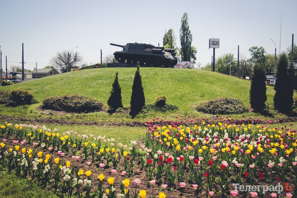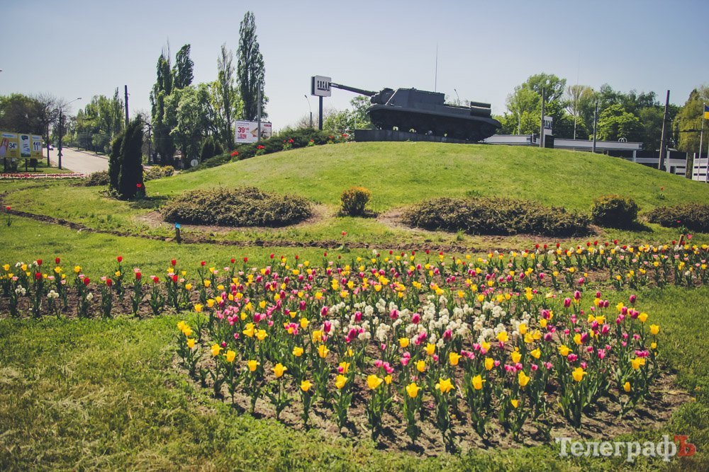 В этом году городские власти Кременчуга решили, что вокруг техники необходимо разбить клумбу. Поэтому сейчас по склону вовсю бегают коммунальники: грядки вспахивают, тюльпанчики садят. На данный момент марафет навели еще не до конца, но Пивзаводовский круг уже на порядок красивее, чем был прошлой весной.