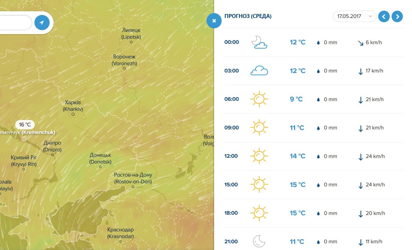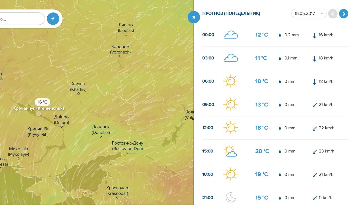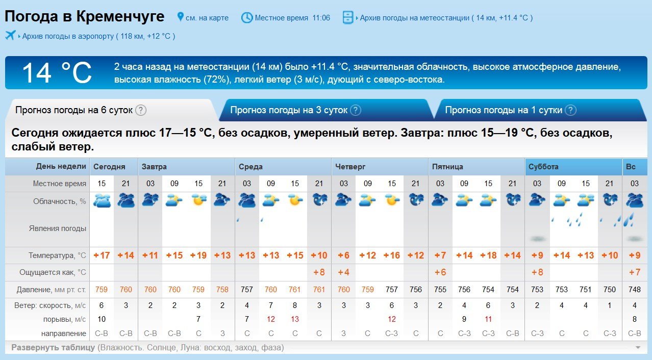 Rp5 попереджає кременчужан про пориви вітру до 13 м/с у середу, 17 травня, четвер, 18 травня, та п'ятницю, 19 травня. За їх прогнозом, злива можлива зранку у середу, 17 травня, а сильна злива періщітиме усі вихідні, 20-21 травня.