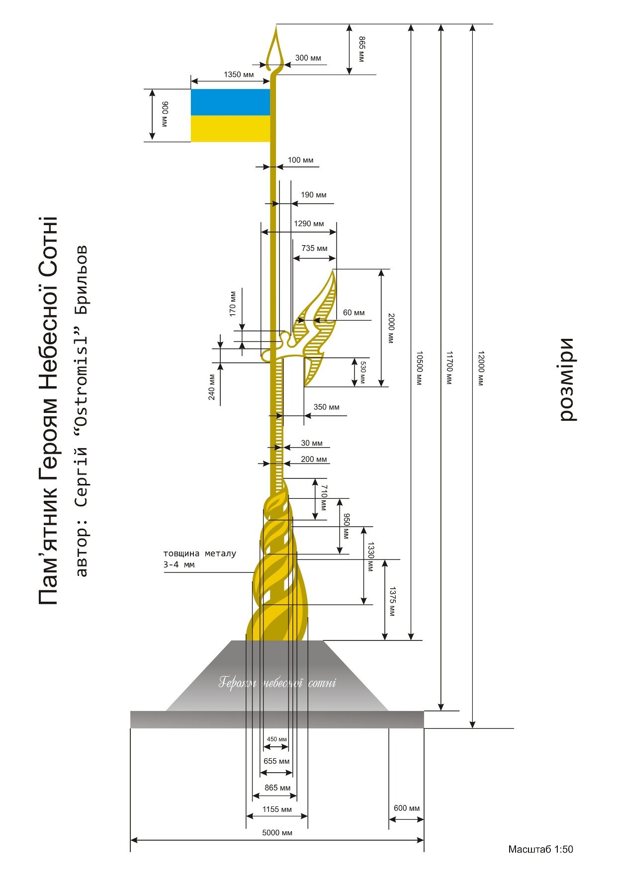 За основу пам’ятного знаку візьмуть ескіз художника Сергія Брильова. Навколо нього встановлять лайтбокси з портретами загиблих під час Революції гідності. Щоб не порушувати ідею паркової зони вони будуть прозорими та підсвічуватись у нічний час.