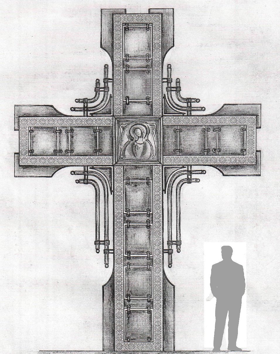6-метровий кований хрест. Він складається з цілих та пробитих пластин, які уособлюють живих та загиблих бійців.