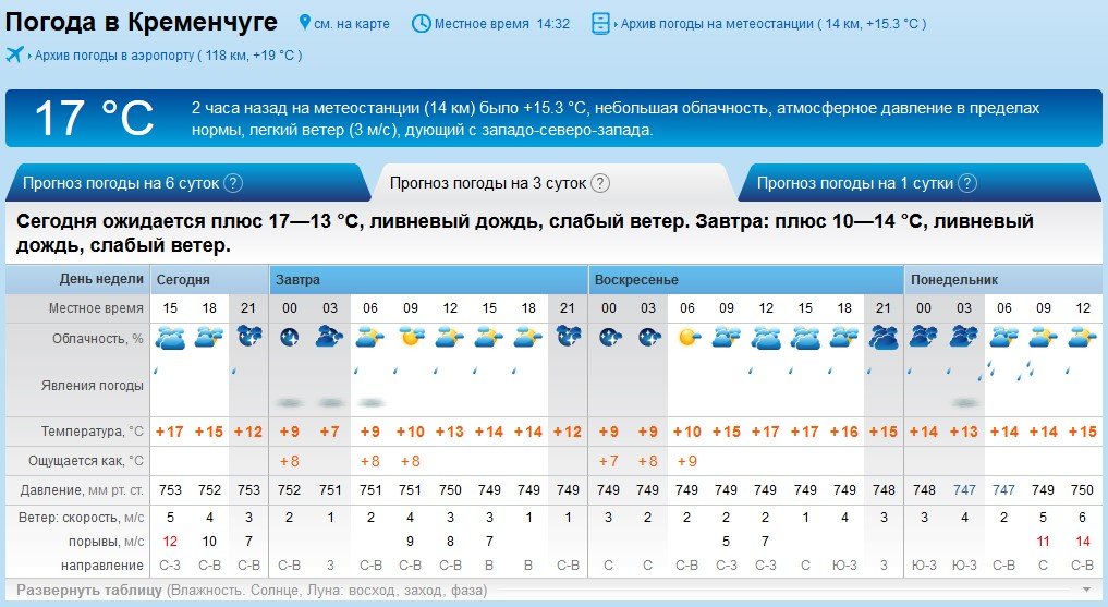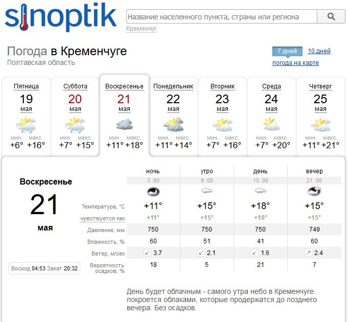 На rp5 кременчужан також попереджають про густий туман зранку суботи, 20 травня, та зливу, яка литиме увесь день. У неділю, 21 травня, післяобід також йтиме дощ.