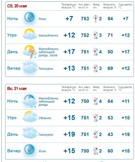 Gismeteo обіцяє нам грозу у суботу, 20 травня, та температуру повітря до +18ºС. Неділя, 21 травня, теж почнеться з дощу, але він закінчиться ще вранці. Небо буде хмарним, а повітря прогріється до +19ºС.