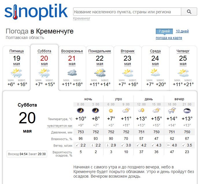 Вже вранці суботи, 20 травня, небо у Кременчуці затягнеться хмарами, які так і не зникатимуть до кінця дня. Ввечері очікується дощ, попереджає Sinoptik.